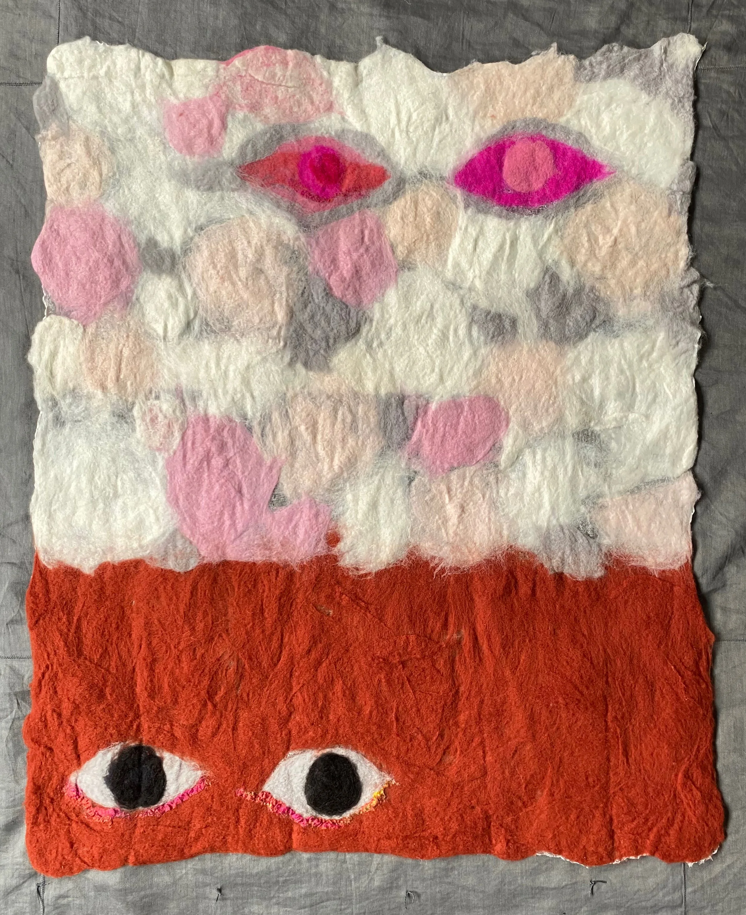 (Felted natural white and black wool, dyed red, blue, chartreuse)